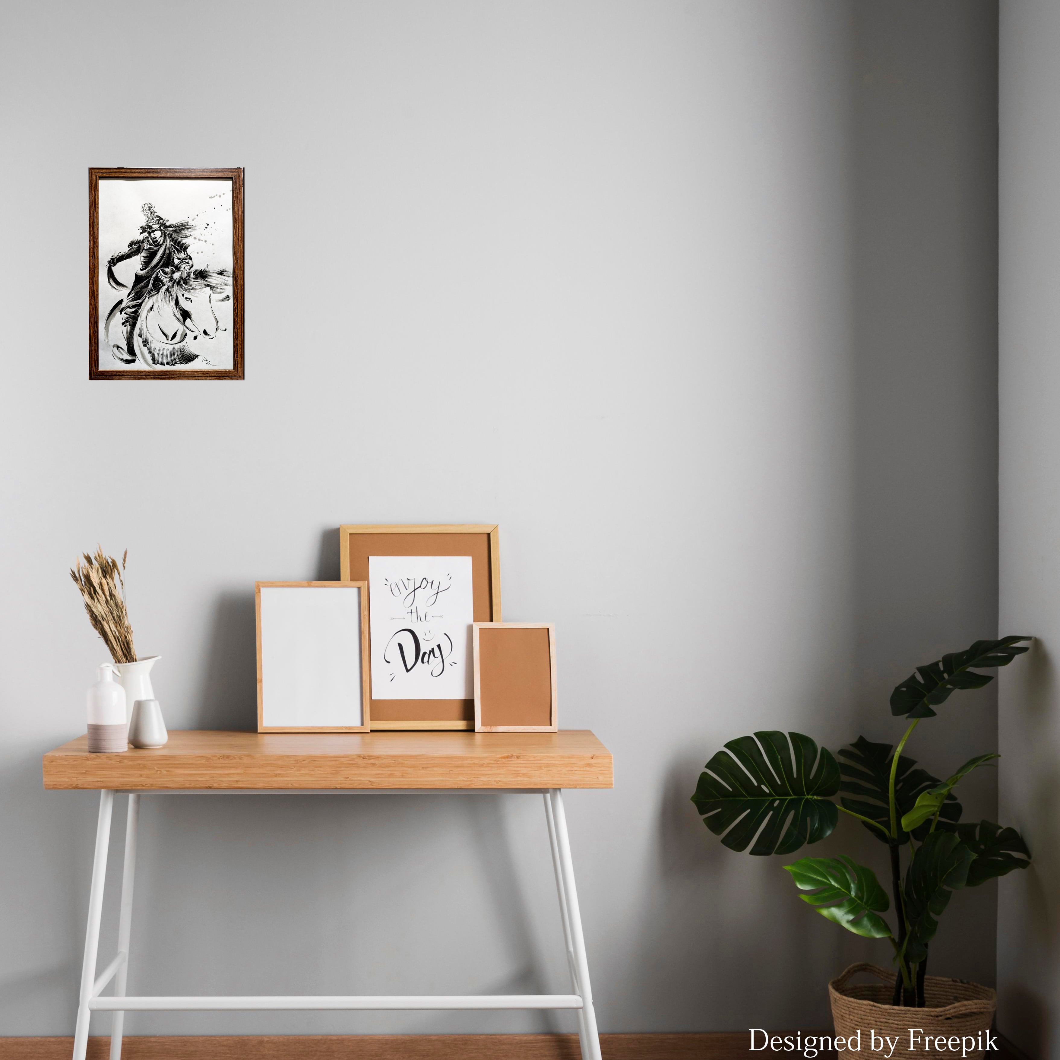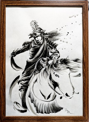 この作品は、戦国時代の名将上杉謙信の威厳を巧みに捉えた墨絵です。飯綱権現の前立ての兜と袈裟を着て強い信仰心を現しています。墨の色合いと繊細な筆遣いが、彼の凛々しさと戦士としての魂を見事に表現しています。この作品を通じて、上杉謙信の深い精神と戦いへの情熱を感じることができるでしょう。