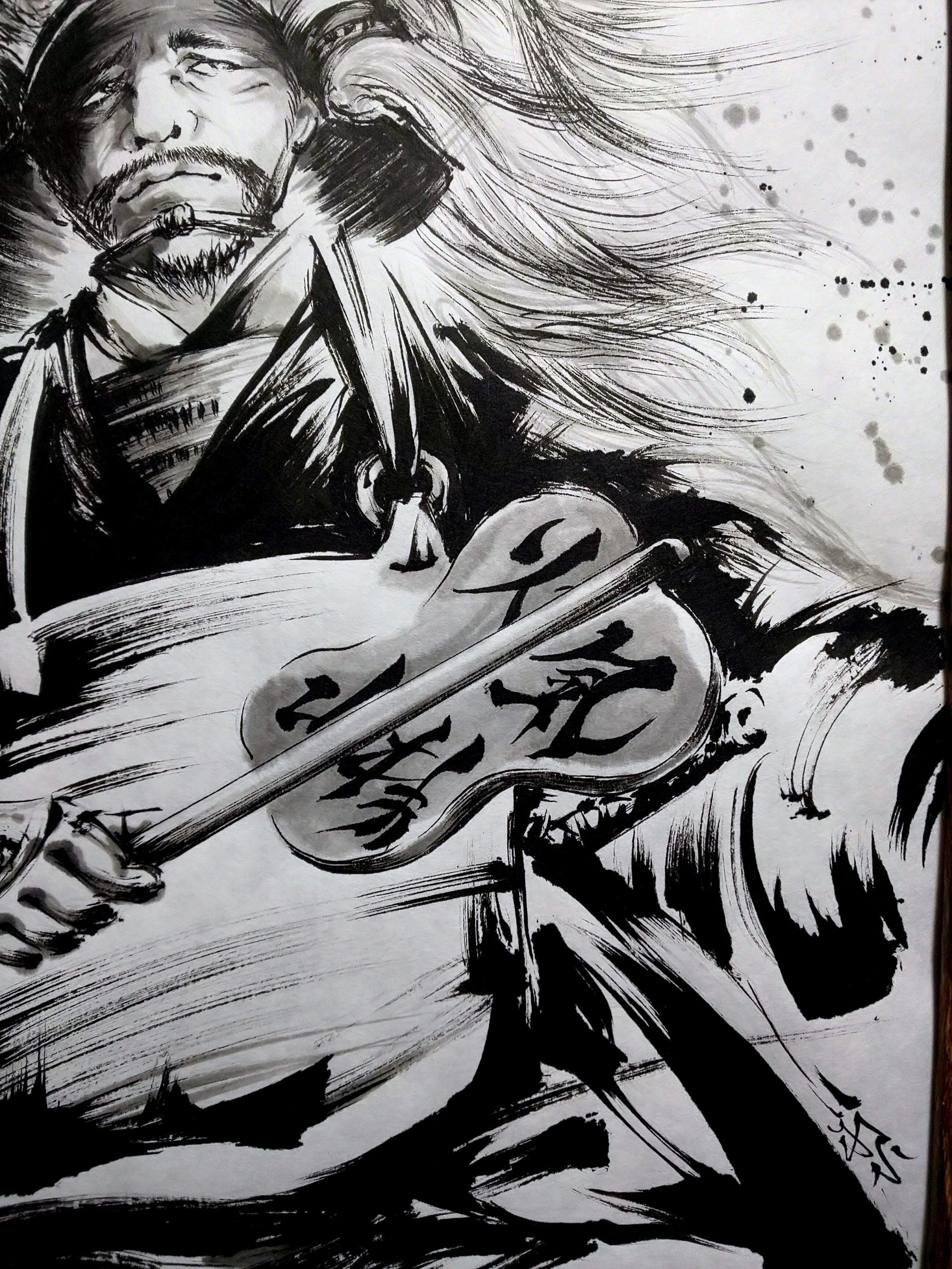この作品は、戦国時代の名将武田信玄の威厳を巧みに捉えた墨絵です。墨の色合いと繊細な筆遣いが、彼の凛々しさと戦士としての魂を見事に表現しています。この作品を通じて、上杉謙信の深い精神と戦いへの情熱を感じることができるでしょう。